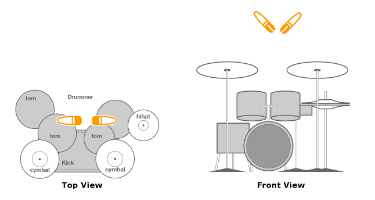 In “room miking behind the kit” we use two mics for each side. These mics are placed behind the kit at least 6 feet from the drum kit. these should be put in 45 degrees angled position and the capsules are pointed towards the drum kit.